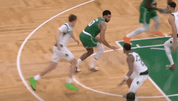 以往塔圖姆是凱爾特人上線持球人,今天更多在翼側(cè)靠無球啟動(dòng),移動(dòng)持球人Movement Ball Handlers,有點(diǎn)類似鵜鶘墨菲、黃蜂米勒的角色。