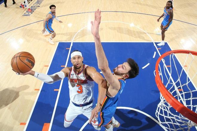 雷霆過去3場連贏掘金、獨行俠與公牛收獲3連勝,尼克斯過去3場連贏雄鹿、馬刺與猛龍收獲3連勝。本場雷霆缺少杰倫與米切爾,尼克斯缺少麥克布萊德與羅賓遜。首節開局雷霆內外開花取得9-3領先,霍姆格倫三分命中維持12-6領先,尼克斯連追4分。霍姆格倫繼續三分命中引領8-0攻勢拉開比分,尼克斯回敬一波8-0追分,雷霆再得5分,尼克斯也連追5分,首節比賽結束雷霆25-23領先尼克斯。首節霍姆格倫出戰8分鐘7中5,其中外線命中4記三分得到14分2籃板。