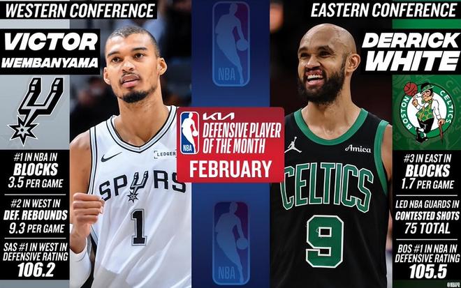 文班亞馬當(dāng)選2月西部月最佳防守球員,凱爾特人后衛(wèi)德里克-懷特則斬獲2月東部月最佳防守球員。