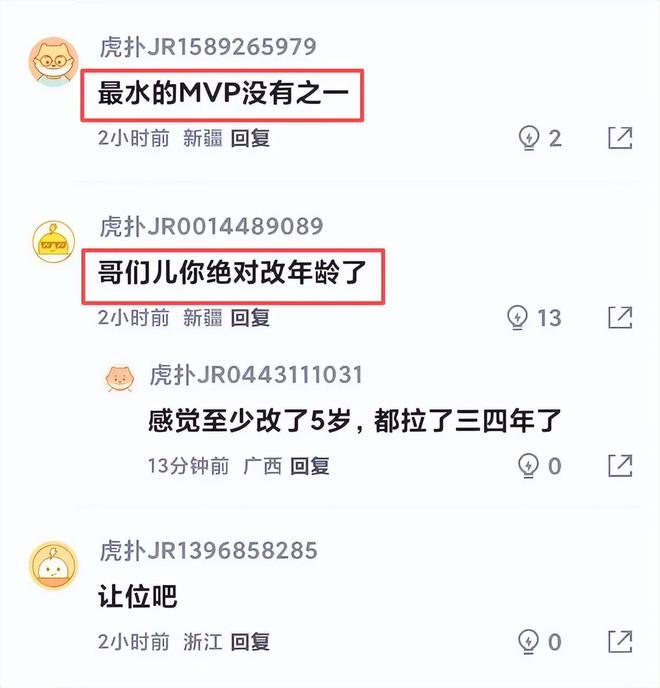 也正因如此,在本場賽后,不少球迷紛紛吐槽:“哥們兒你絕對改年齡了”、“經典18歲打上CBA,31、32歲tm快退役了”、“最水的MVP沒有之一”、“真的退役吧,防不住打不進就別浪費別人的機會了”、“一如既往的穩定,上來球隊就輸分”......