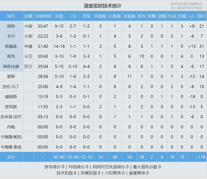 上半場打完,圣迭戈快船58-52反超混音隊6分。楊瀚森出戰(zhàn)15分鐘,8投8中,三分1中1,砍下17分3籃板2助攻1搶斷0失誤,正負值+7全隊最高。快船中鋒弗里曼托15中8拿到18分6板2助,小泰泰-華盛頓10中8砍下17分7助。