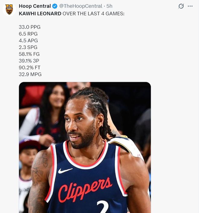 此役倫納德開場(chǎng)就火力全開單節(jié)10中8拿到18分,上半場(chǎng)就拿到28分,全場(chǎng)比賽32分鐘,20中15,三分9中6,罰球10中9,拿到45分5籃板5助攻2搶斷1失誤0犯規(guī),命中率75%,三分命中率66.7%,真實(shí)命中率92.2%,正負(fù)值+41。