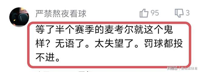 麥考爾糟糕的表現,也讓廣東球迷大失所望,紛紛在網絡平臺吐槽。“等了半個賽季的麥考爾就這個鬼樣?無語了。太失望了。罰球都投不進。”;“看了兩場球,運球和突破能力弱的一逼,水平太一般了,沒啥硬解能力!”;“打了兩場了,啥水平看不出來嗎?而且大傷了,不知道哪的自信?”;“不要懷疑朱杜選外援的眼光,從來沒有選到一個能打球的。”……