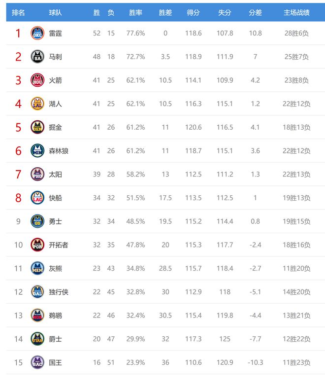 今日比賽后火箭、湖人排名互換,其他西部球隊(duì)排名不變。
