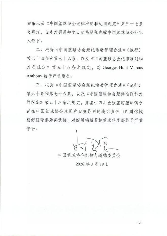 籃協紀律與道德委員會經過立案、核查,中國籃協紀律與道德委員會今日頒布〔2026〕1號處罰決定,針對張吉驥、外援亨特及四川錦城藍鯨籃球俱樂部的合同違規行為作出處理。