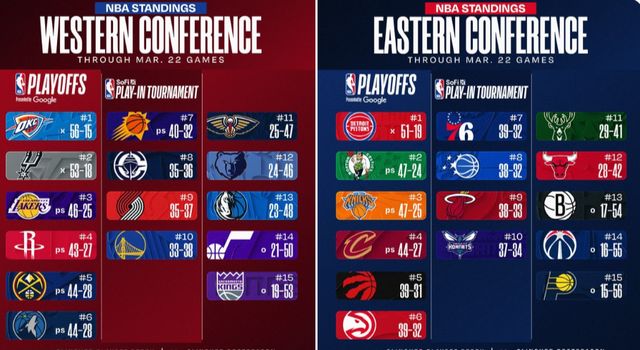 1.魔術57勝25負、2.尼克斯50勝32負、3.老鷹47勝35負、4.步行者47勝35負、5.猛龍46勝36負、6.雄鹿44勝38負、7.騎士44勝38負、8.熱火42勝40負、9.公牛41勝41負、10.凱爾特人40勝42負、11.76人37勝45負、12.活塞36勝46負、13.黃蜂23勝59負、14.籃網13勝69負、15.奇才12勝70負