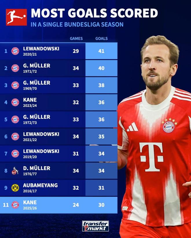 11. 哈里-凱恩(拜仁慕尼黑) 24場30球(2025-26賽季)