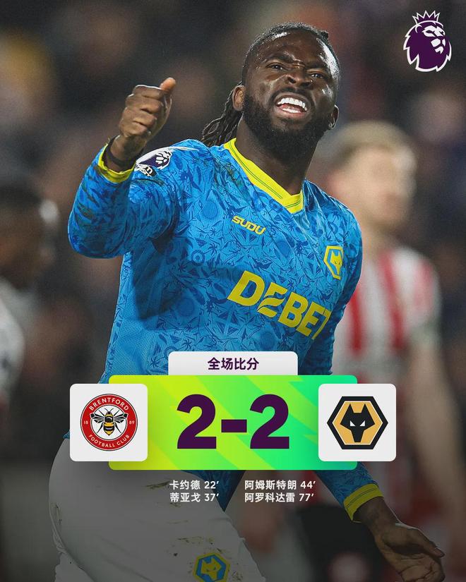 如果你只看比分板,布倫特福德2-2狼隊,這不過是英超第30輪一場普通的平局。