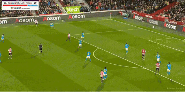比賽一開始,主場作戰的布倫特福德迅速占據主動。第22分鐘,劉易斯·波特右路送出精準傳中,卡約德在禁區內高高躍起,力壓防守球員完成頭球破門,狼隊0-1落后。進球之后,布倫特福德攻勢更加兇猛。