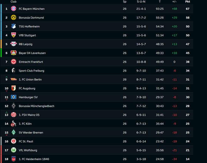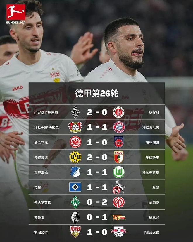 隨著北京時間3月16日凌晨進行的歐冠席位的關鍵爭奪戰中,斯圖加特1比0力克萊比錫,德甲第26輪全部比賽全部結束。被罰下2人的拜仁慕尼黑,在客場1比1艱難逼平勒沃庫森;而多特蒙德2比0擊退前來造訪的奧格斯堡,將與拜仁的分差縮小至9分;霍芬海姆戰平沃爾夫斯堡后積50分,而斯圖加特贏球后積分也來到了50分,因凈勝球劣勢屈居第四;RB萊比錫積47分排名第五,勒沃庫森積45分,本輪遺憾錯失了反超萊比錫的機會。