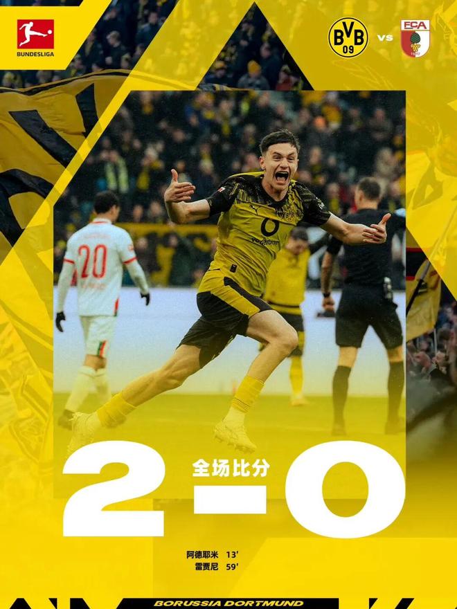 北京時間3月14日晚10點30分,多特蒙德主場迎戰奧格斯堡。上半場比賽,阿德耶米射門擊中對手門將達門面部彈進球門,多特主場取得領先,拜爾、阿德耶米隨后擊中門框,與改寫比分失之交臂。下半場比賽,小將雷賈尼頭球破門,他也以18歲64天的年紀成為德甲歷史上最年輕的意大利進球者,達門貢獻多次撲救。最終,多特蒙德主場2比0擊敗奧格斯堡,將與拜仁的分差縮小至9分。