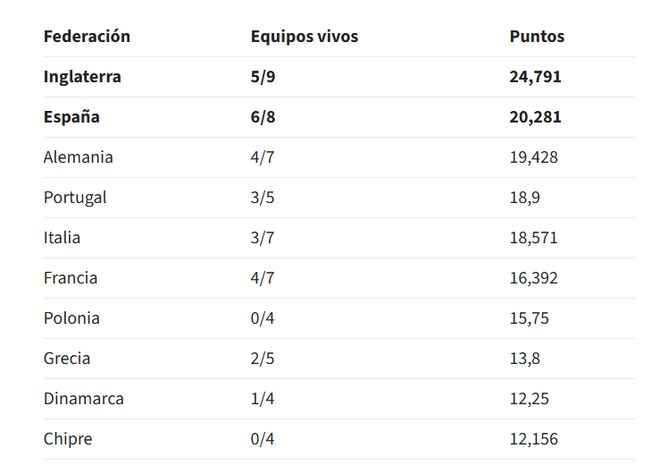 目前,英超和英格蘭牢牢占據(jù)著第一把交椅,那個(gè)額外的名額他們基本穩(wěn)了。現(xiàn)在真正的爭(zhēng)奪戰(zhàn)是在西班牙和德國(guó)之間展開(kāi),雙方都在為第五個(gè)歐冠名額拼得你死我活。